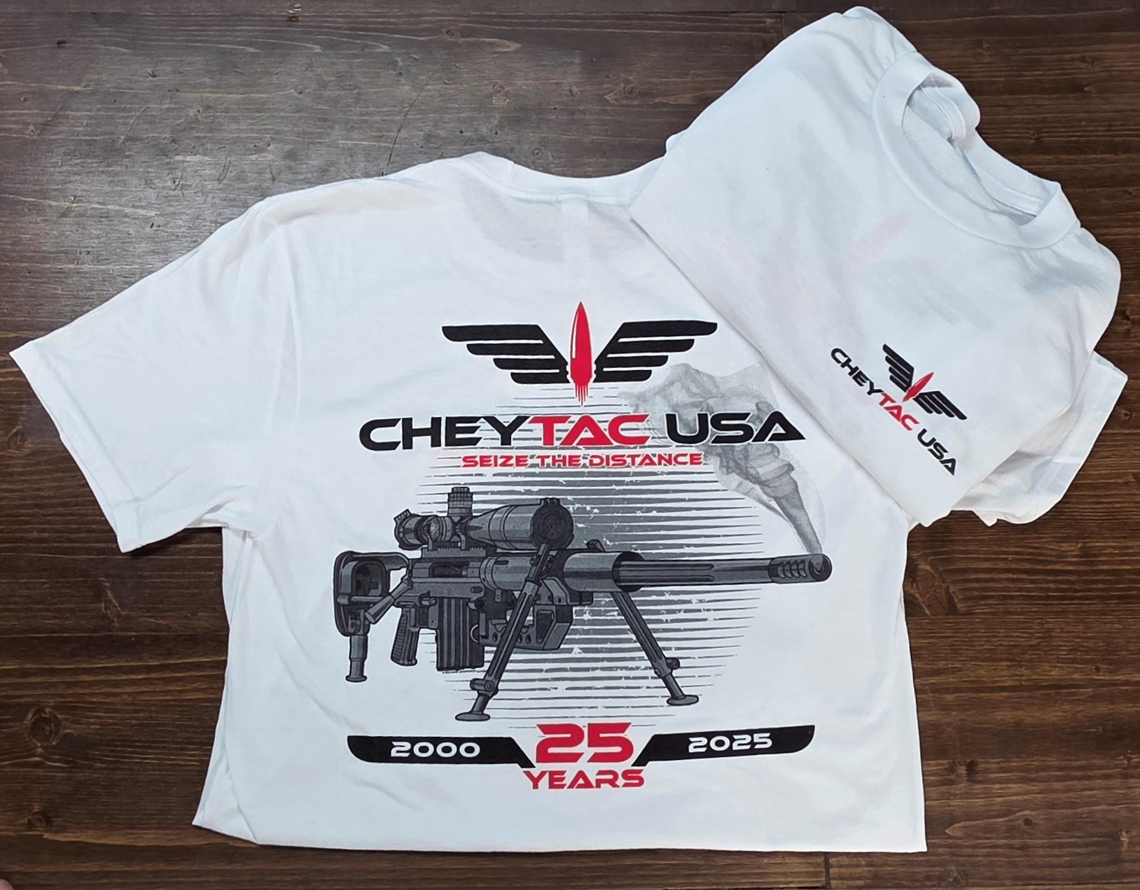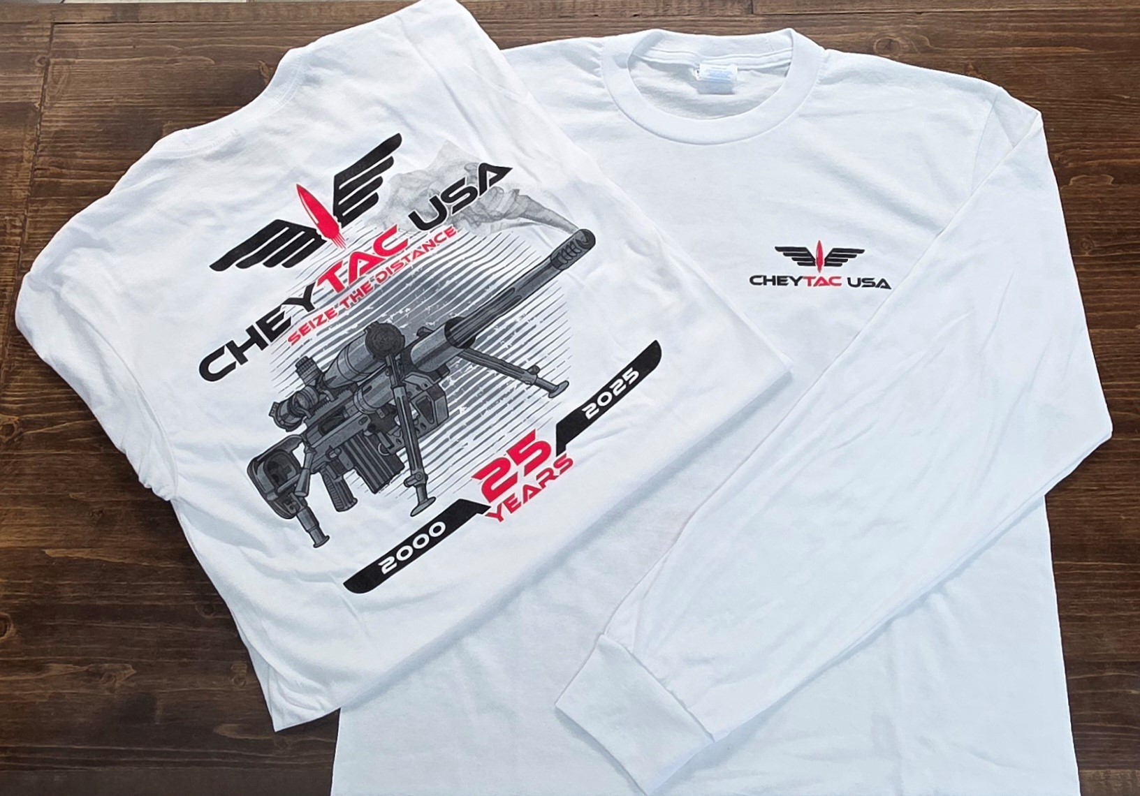 Celebrate 25 years of precision, innovation, and legacy with the official CheyTac USA 25th Anniversary Shirt. Crafted from premium cotton, this comfortable tee features the iconic CheyTac USA logo on the front chest and a bold commemorative design on the back showcasing our world-renowned precision M200 Intervention rifle system. This shirt design is available in both long and short sleeve 100% cotton shirt.Â