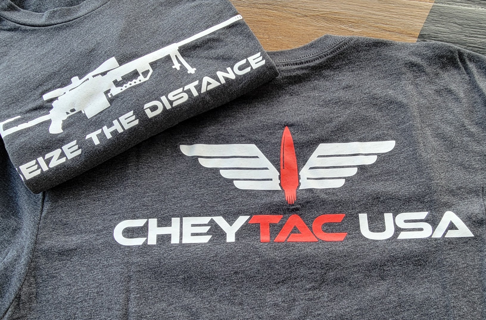 Dark gray with white and red print. Comfortable unisex T-shirt with M200 Intervention® and Seize the Distance on the front, and large color logo on back. Available in sizes LG-2XL.
