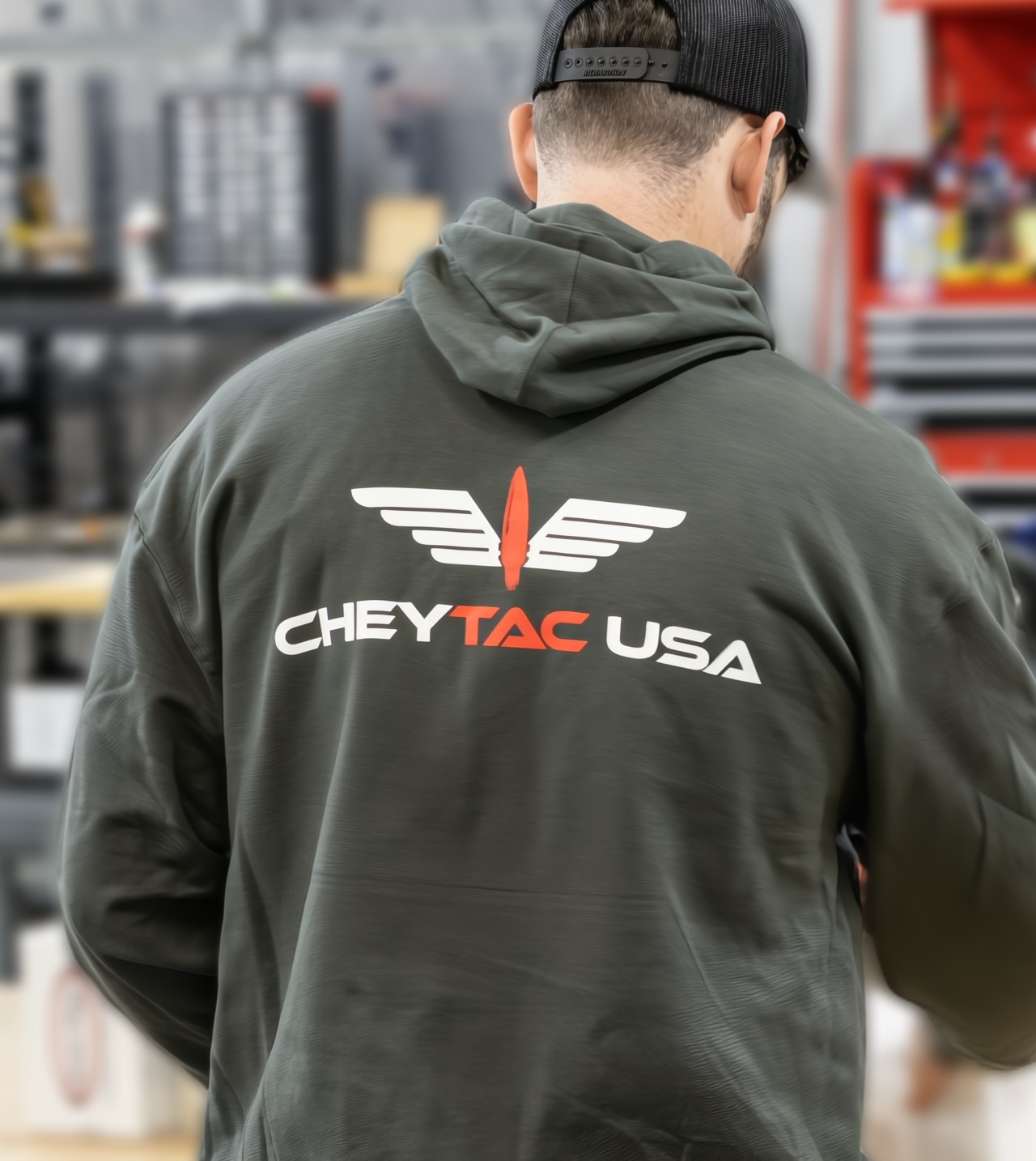 Comfortable charcoal grey hooded sweatshirt with “Seize the Distance” on the front, and large color Cheytac logo on the back. Available in sizes L-2XL
